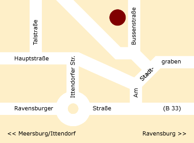 Im Kreisverkehr in Richtung Ravensburg weiterfahren und an der nächsten Kreuzung links in den Stadtgraben, dann der abknickenden Vorfahrt in die Bussenstraße nach links folgen. Nach ca. 300 m finden Sie uns auf der linken Seite.